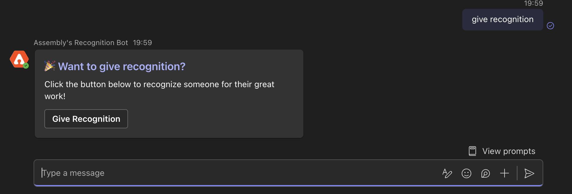 You can give recognition directly from your Assembly ‘chat’ conversation using our app’s shortcut