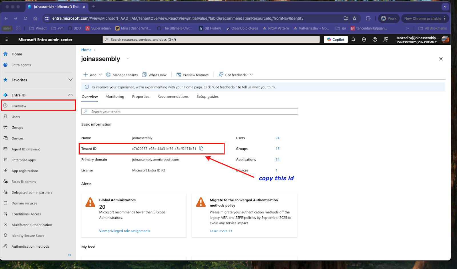 Once logged in, locate and copy your Microsoft Entra Tenant ID. (The location of the Tenant ID is typically visible on the main 'Overview' page or 'Tenant properties'.)