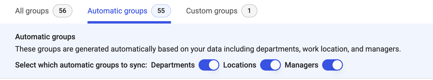 You can create custom groups as well as manage automatic groups created based on department, work location, and manager status information